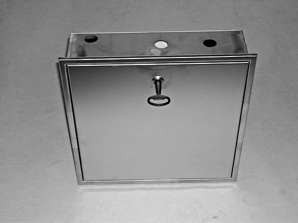 Versorgungskasten für Wasser aus CrNi-Stahl, geschliffen mit Reiberverschluss. Türe demontierbar.